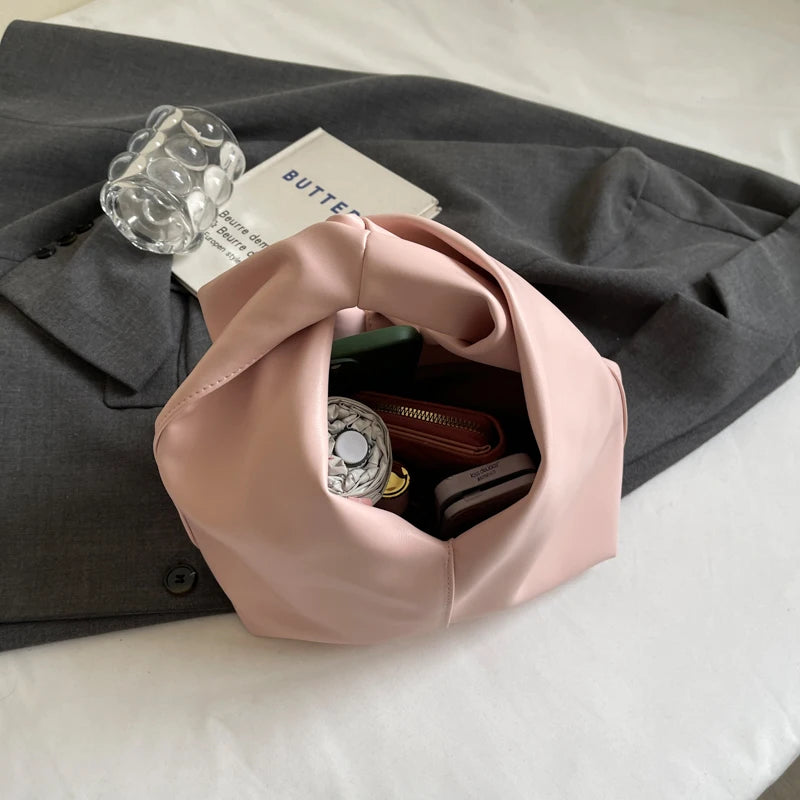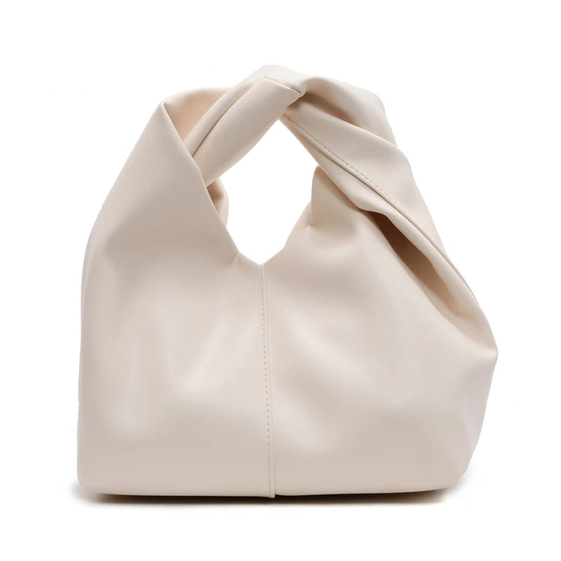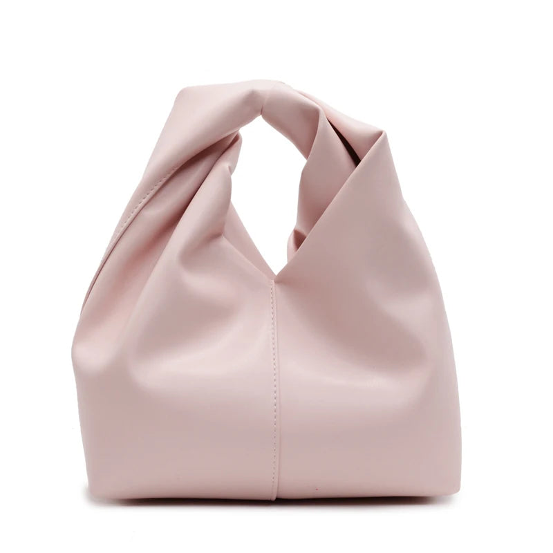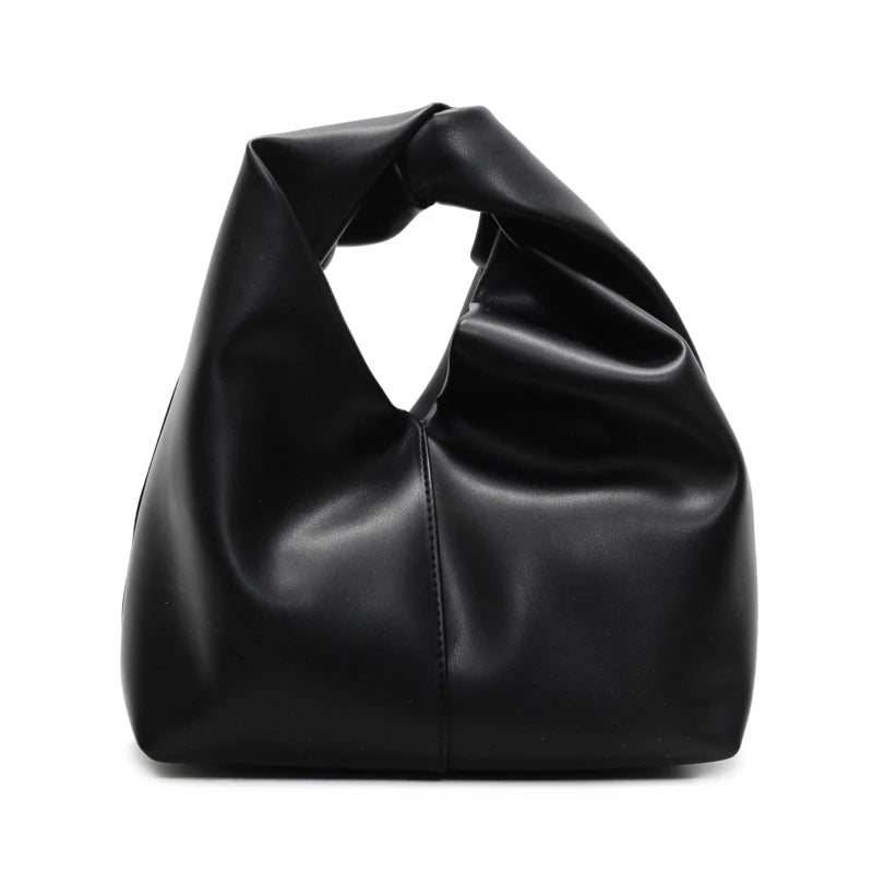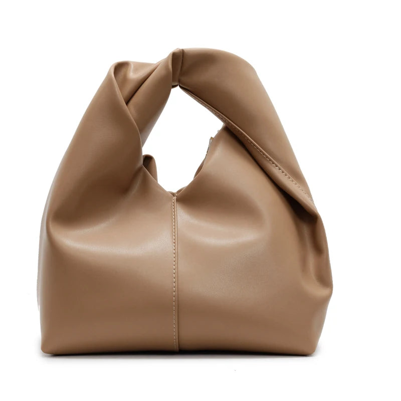 柔らかいフェイクレザーを使用した、くしゅっとしたフォルムが特徴のハンドバッグ。