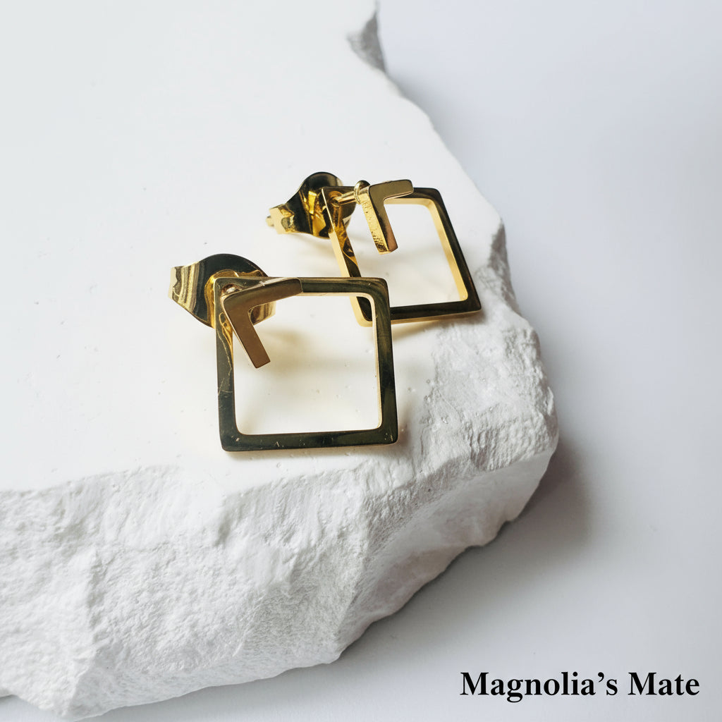 このイヤリングは、シンプルなスクエア型デザインが特徴で、洗練された印象を与えます。
