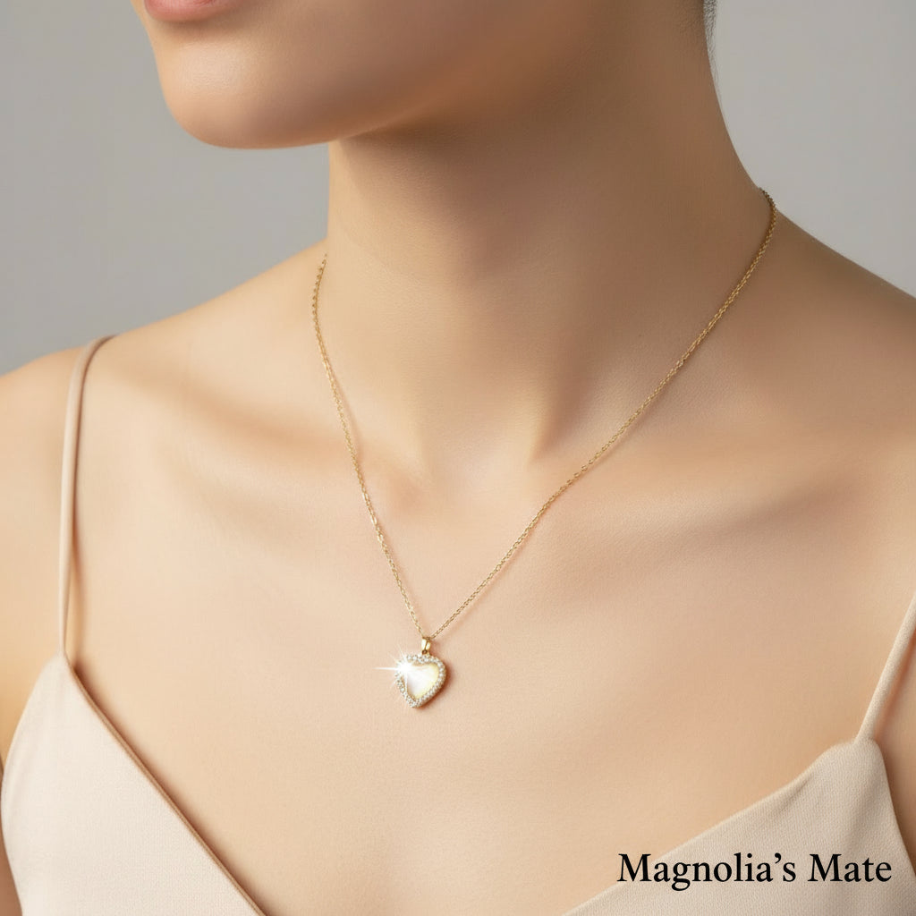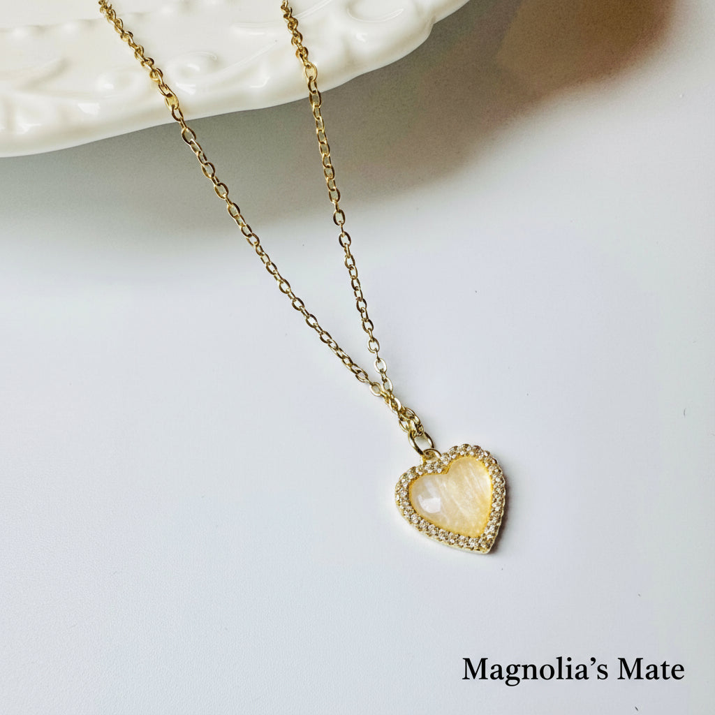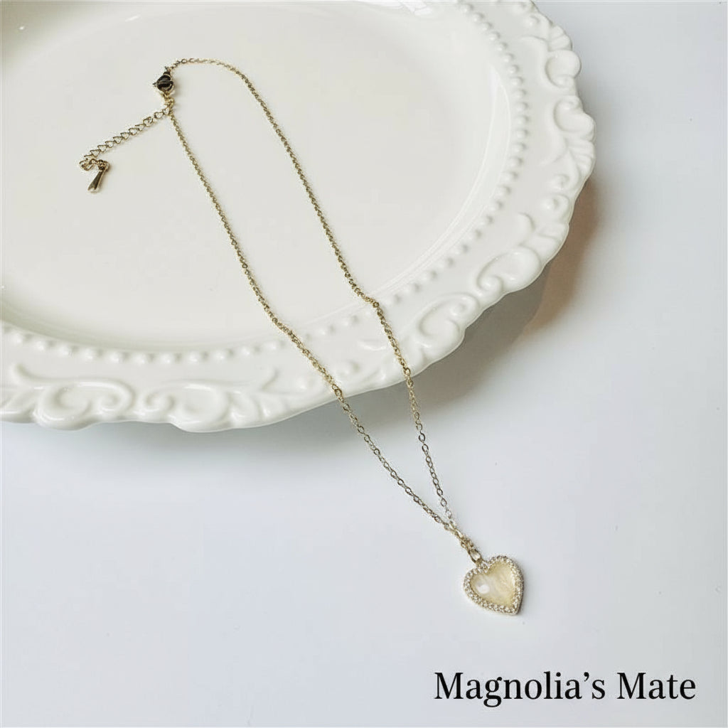 ゴールドチェーンに吊るされたハートは、繊細でありながら目に留まるデザイン感を放ちます。