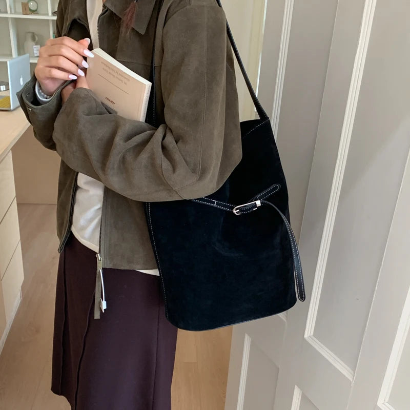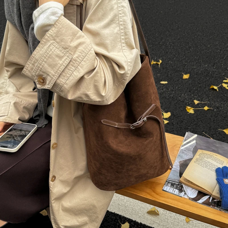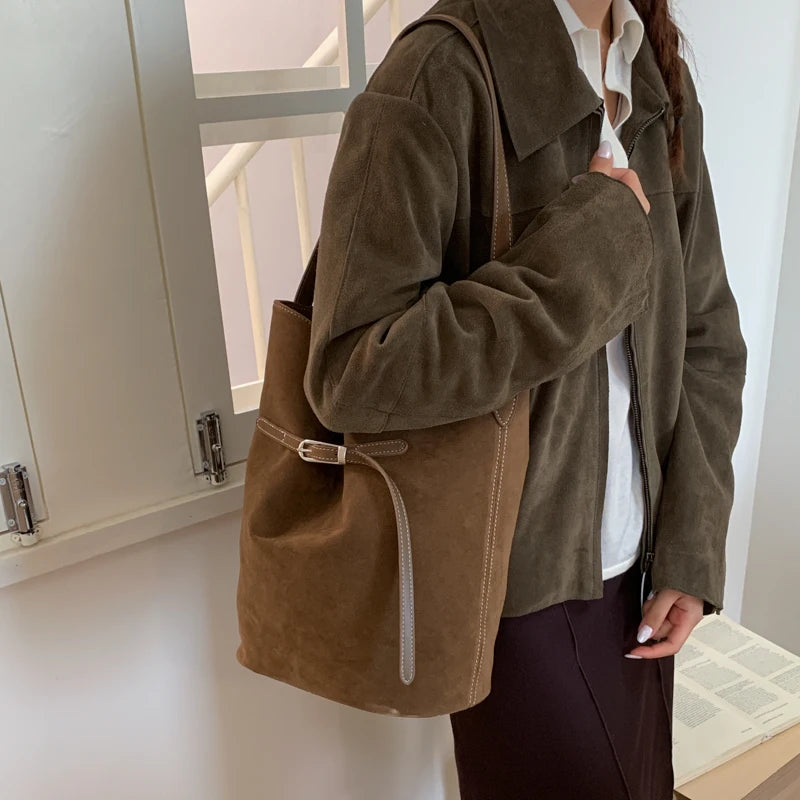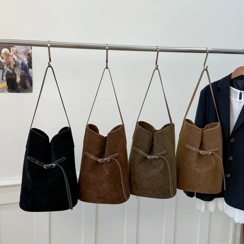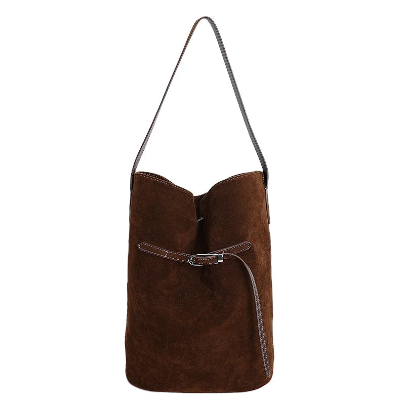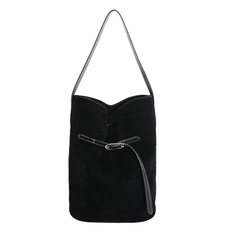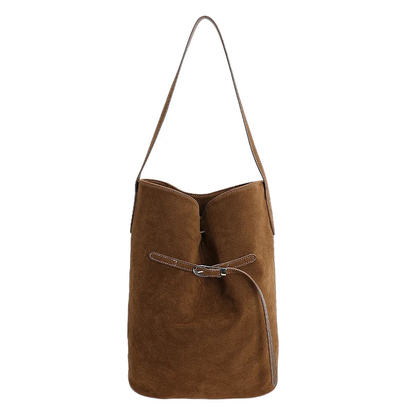 スエード調素材を使用したバケットシルエットのワンショルダーバッグ。