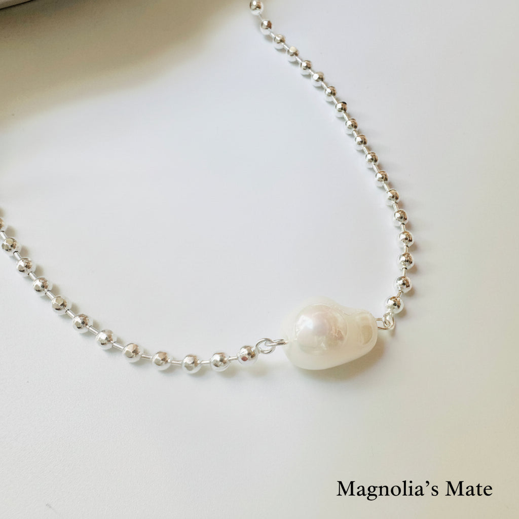 キュービックカットのシルバーボールチェーンがキラキラ輝く、トレンドのY字ネックレス。