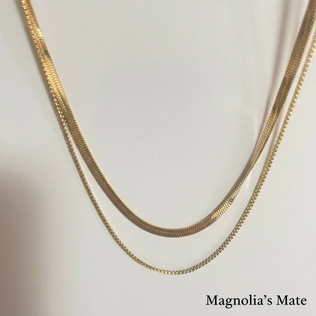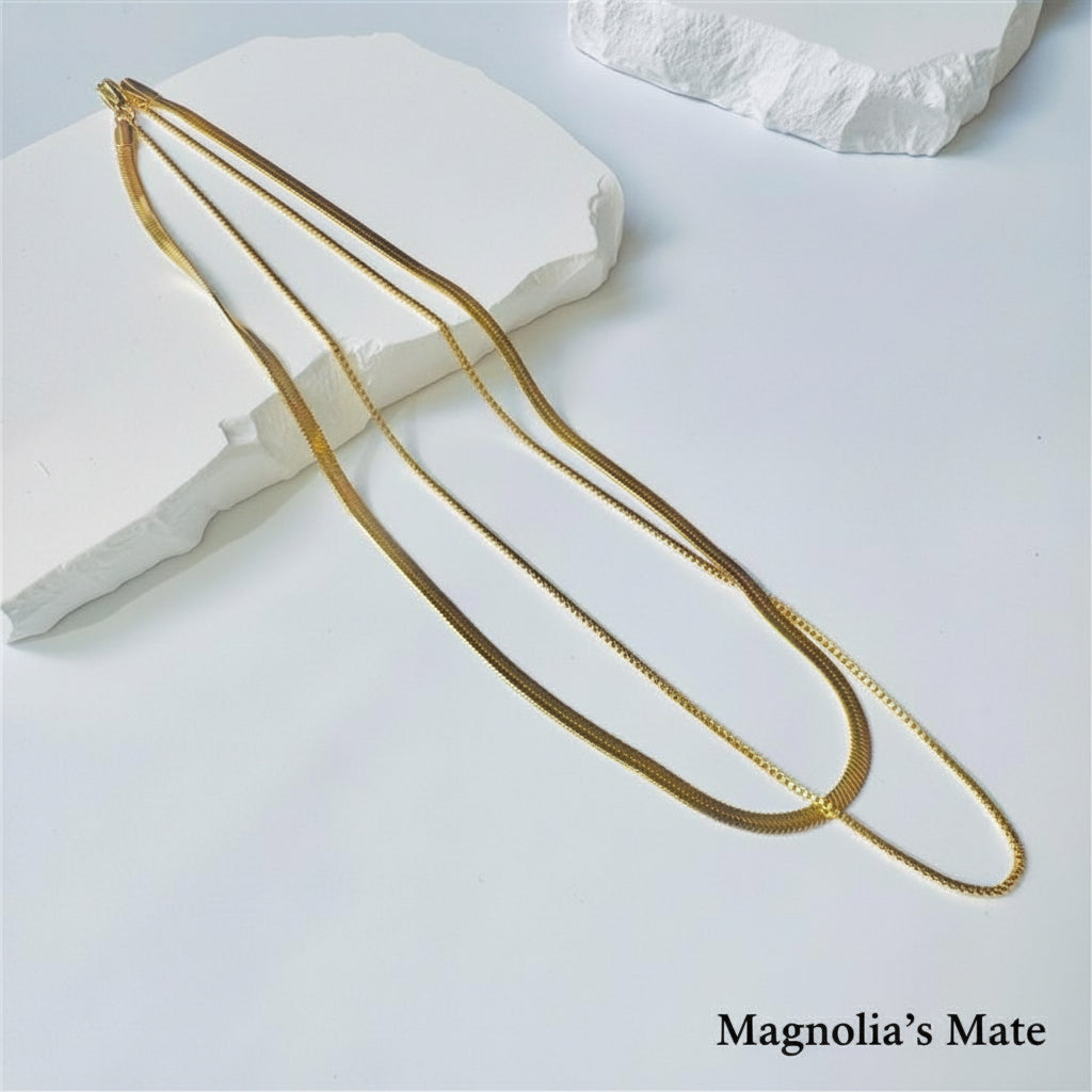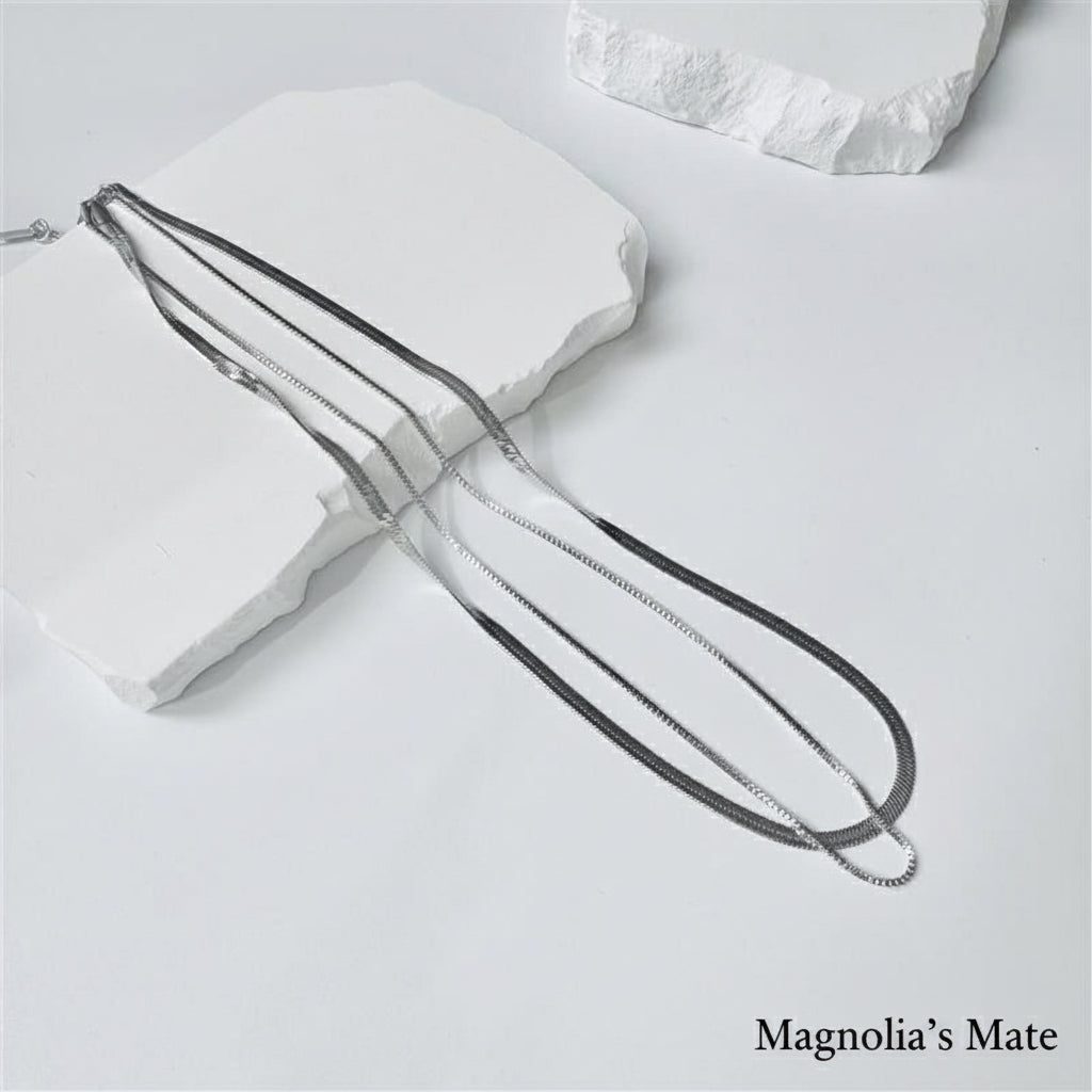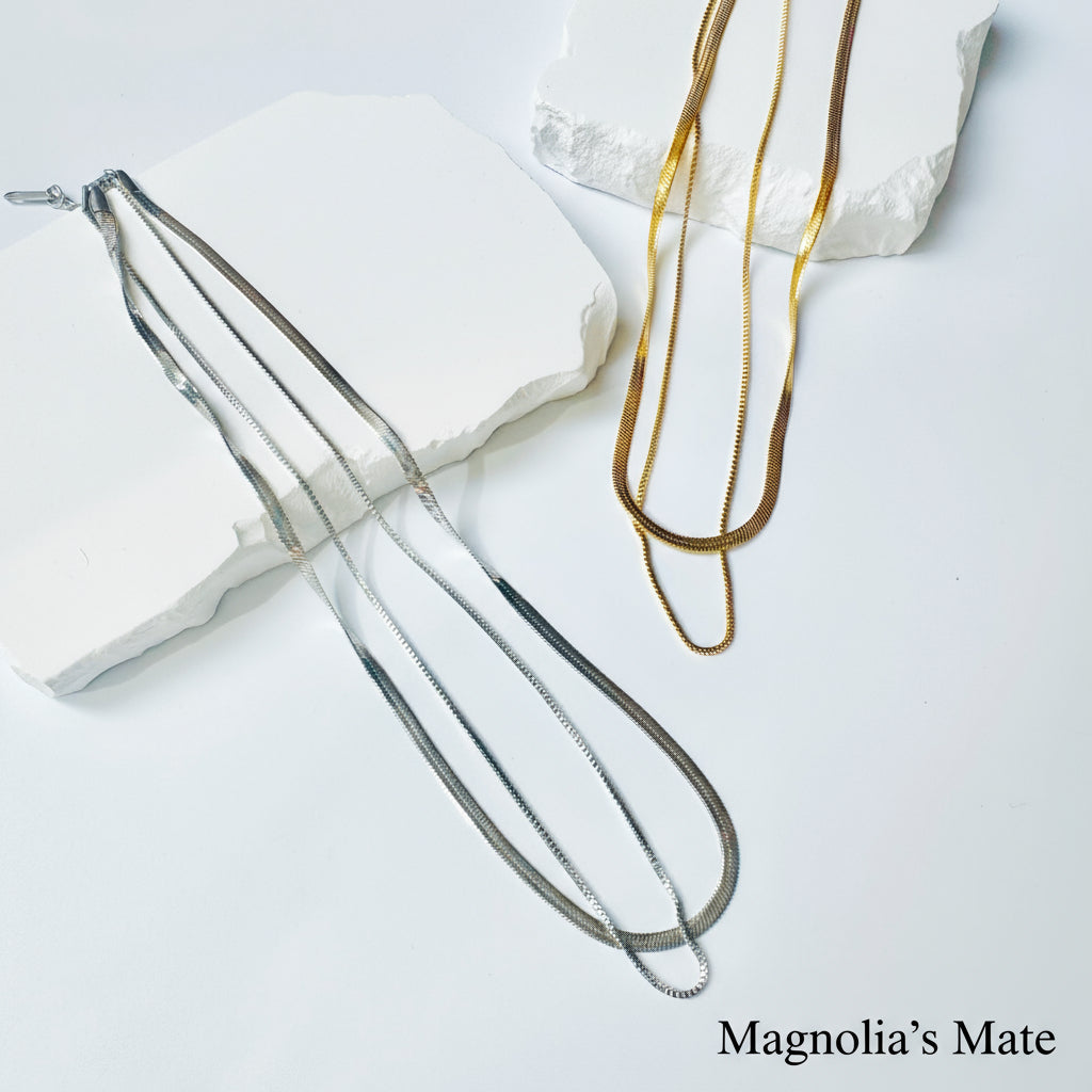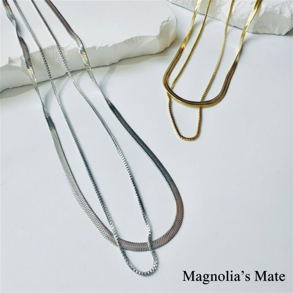異なる長さのチェーンが絶妙なバランスを生み出し、首元に美しいアクセントを加えます。