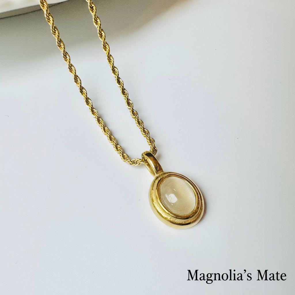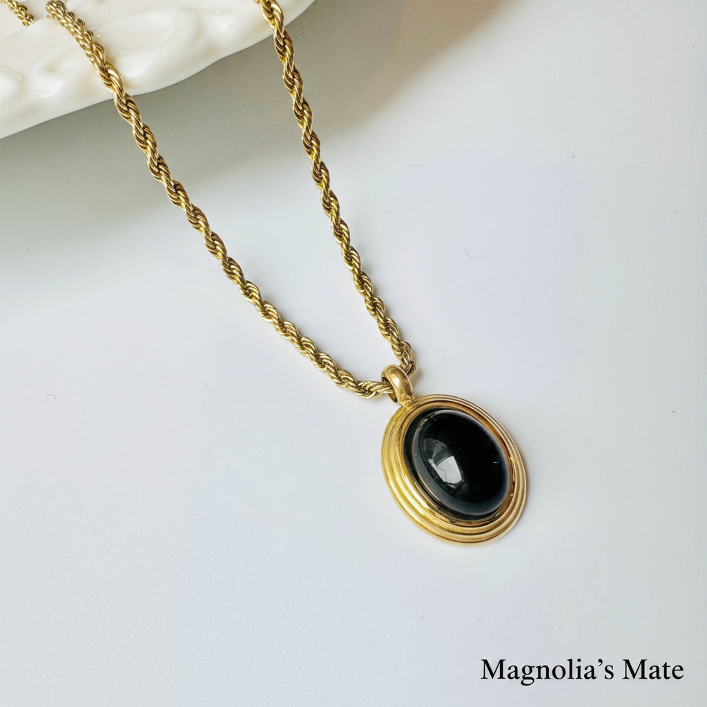 重厚感のあるチェーンと楕円のストーンが美しいネックレスです。