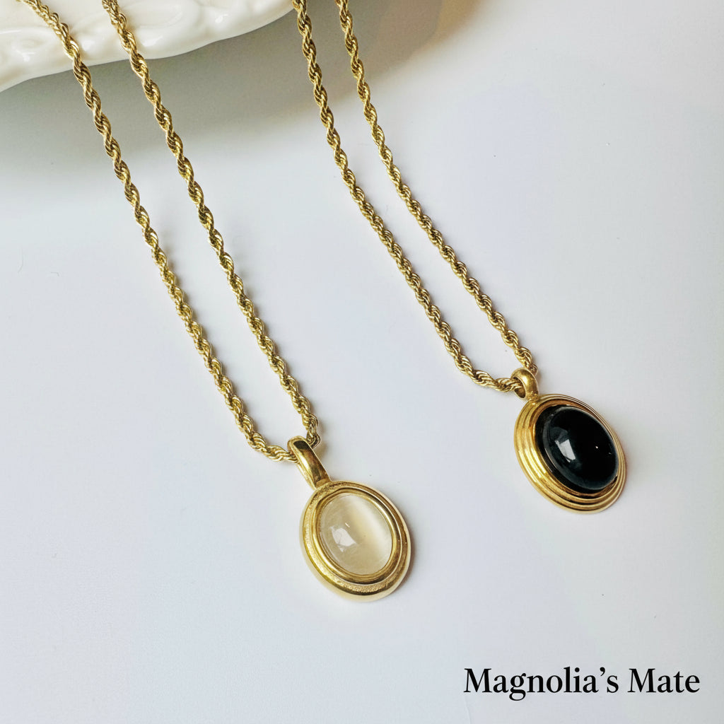 オーバルストーンねじれチェーンネックレス ブラック/ホワイト 【スピード配送】