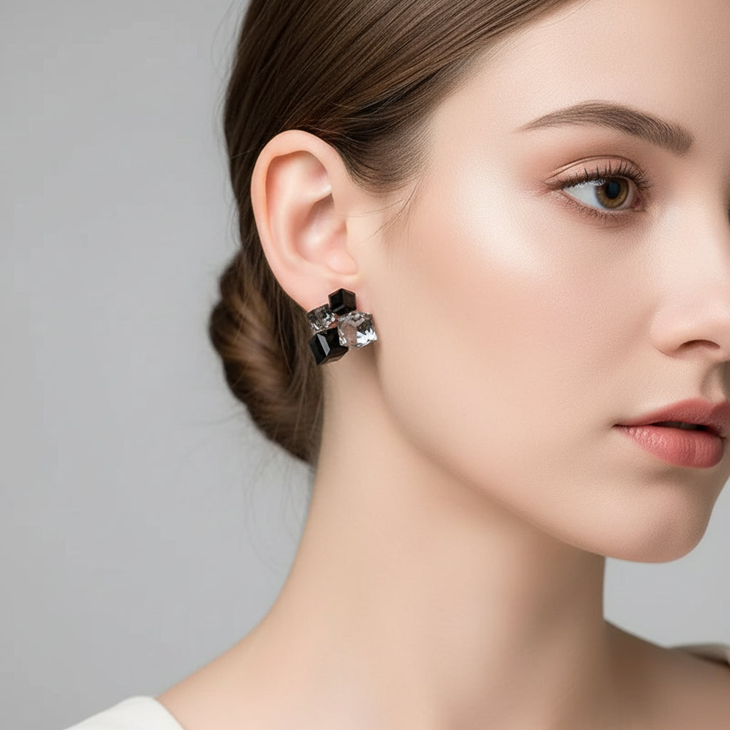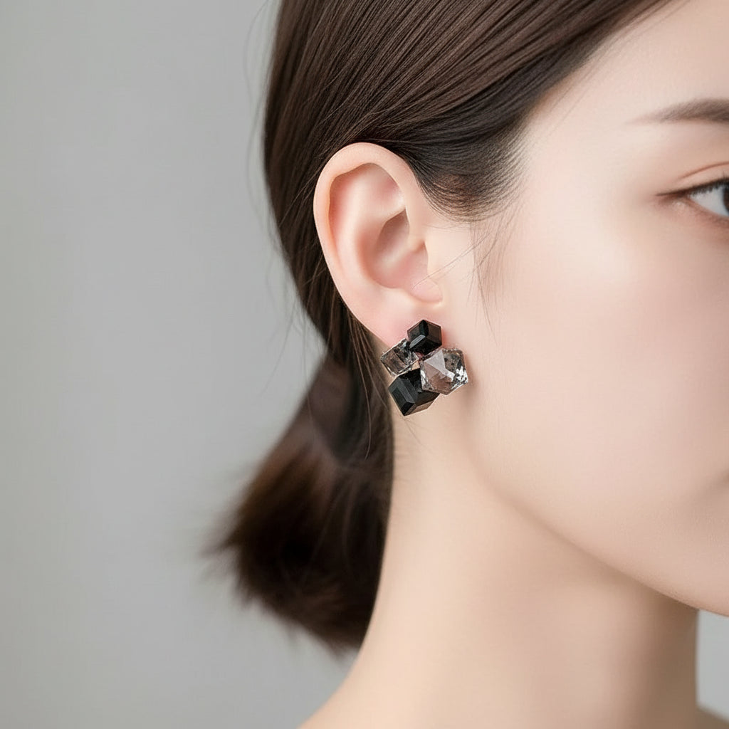 四角形のカラフルなクリスタルが絶妙なバランスで配置され、耳元に華やかさと個性をプラスします。