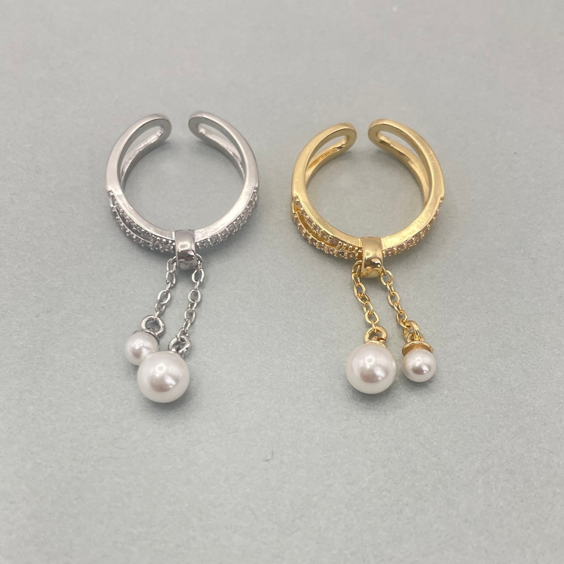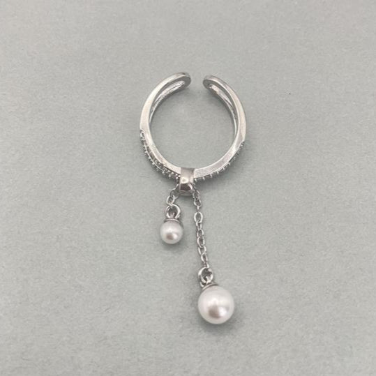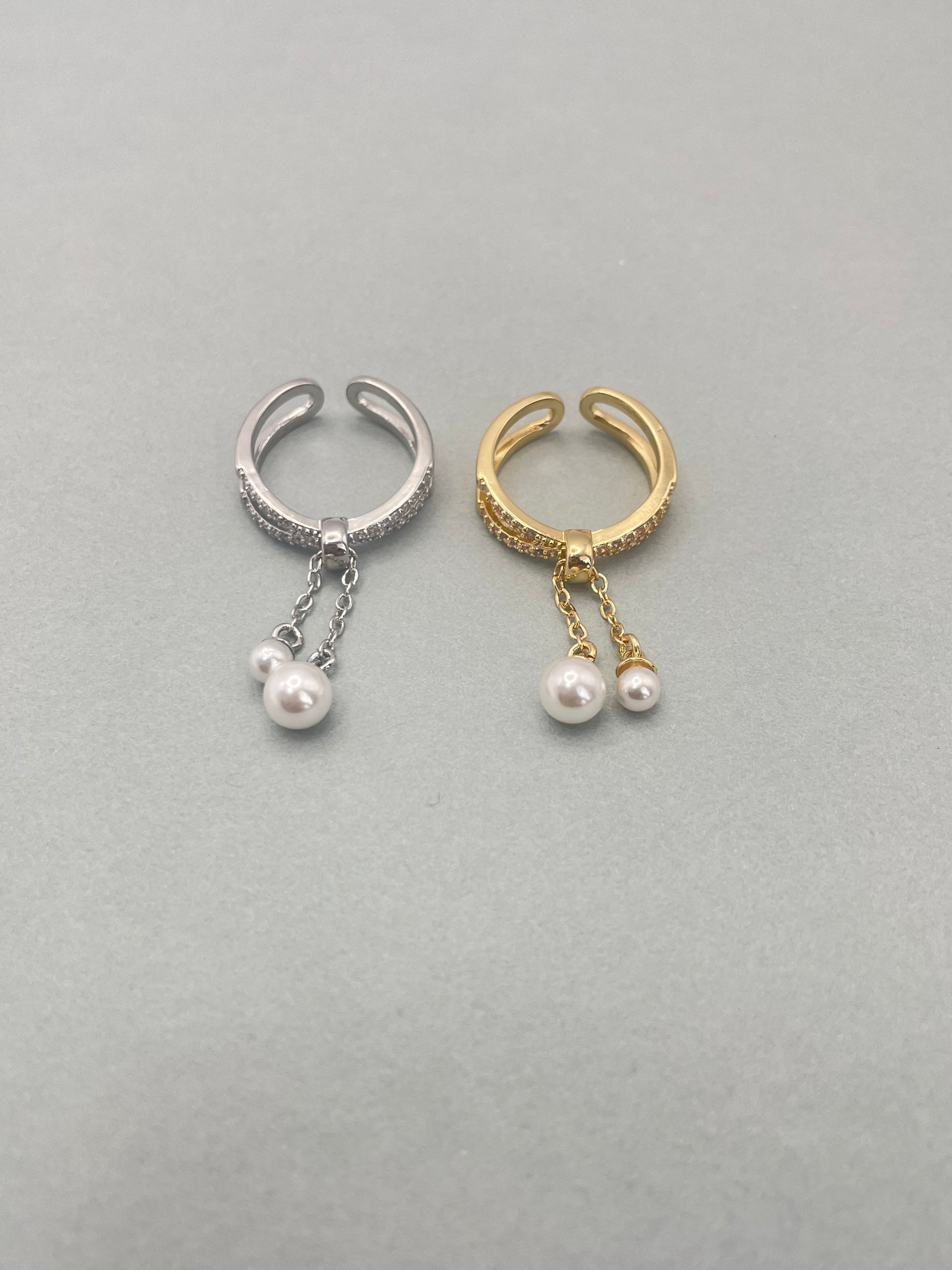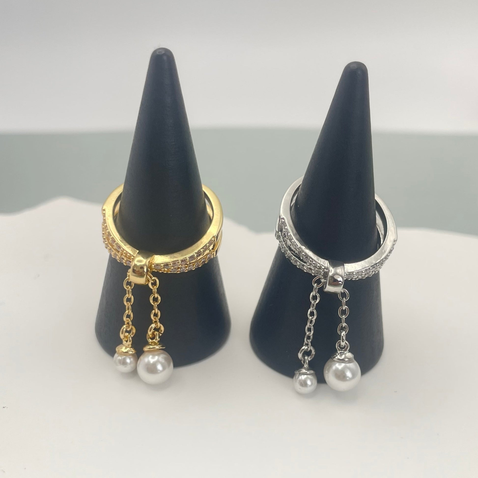 リボンモチーフに繊細なパールが揺れるデザインのリング。