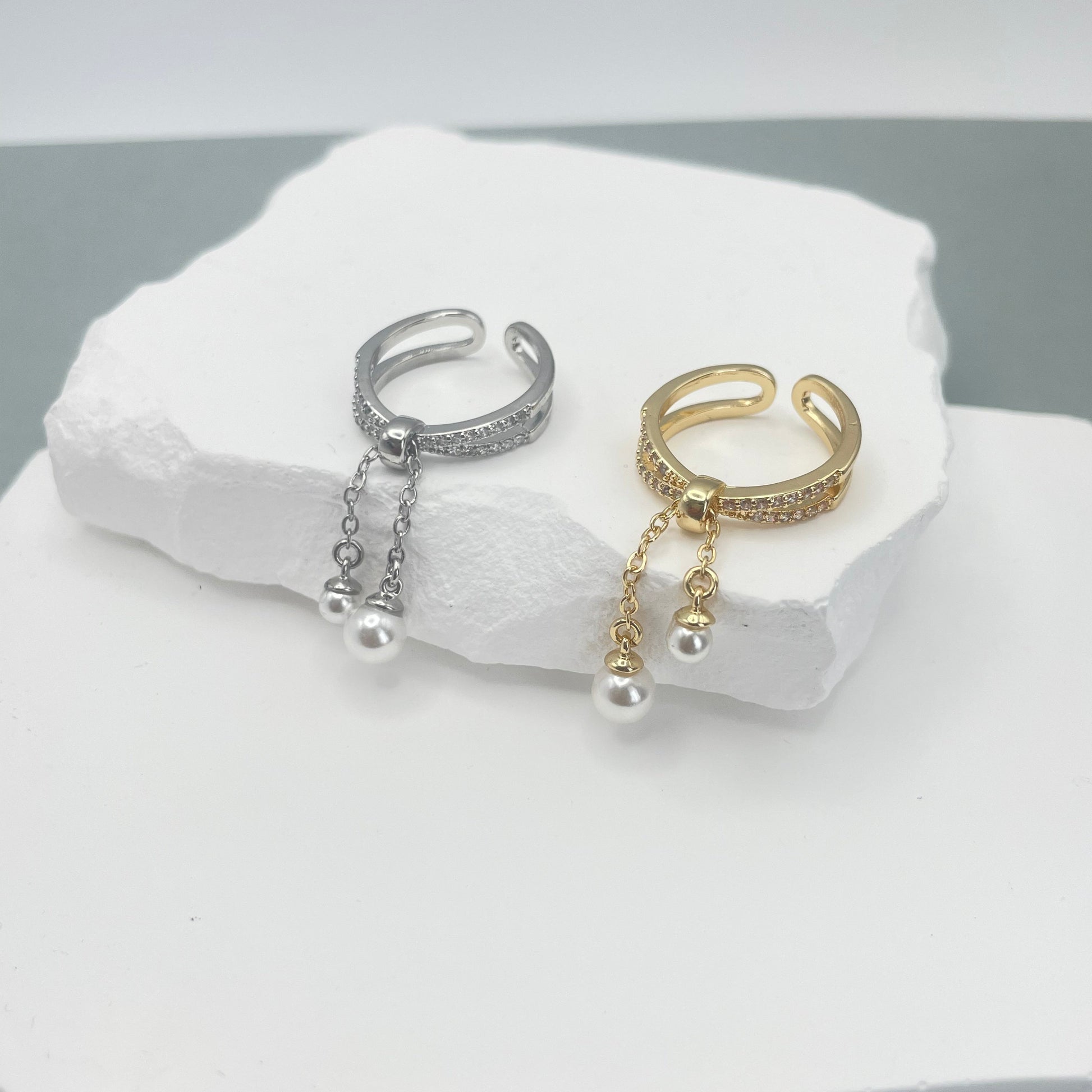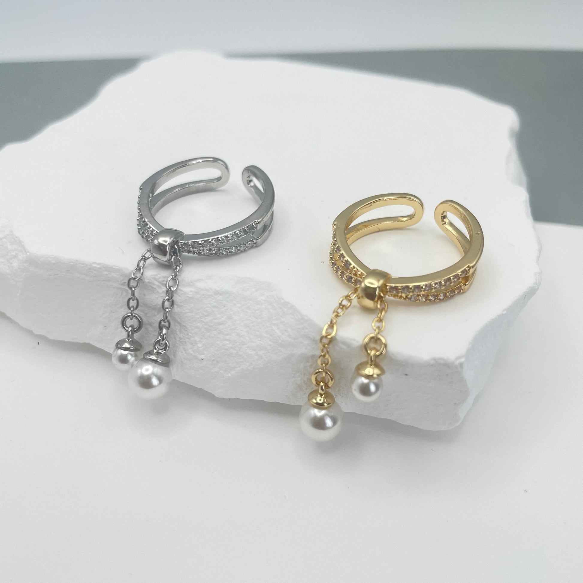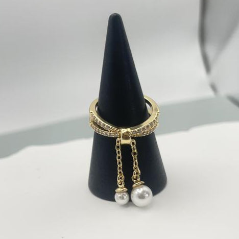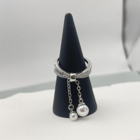 リボンモチーフに繊細なパールが揺れるデザインのリング。
